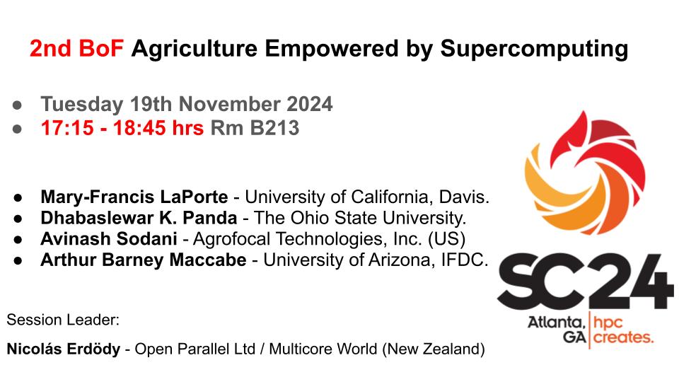 - Through the BoF content posted online, attract end-users (farmers, corporations, governments), who are not necessarily familiar with how supercomputing could empower the sector.
